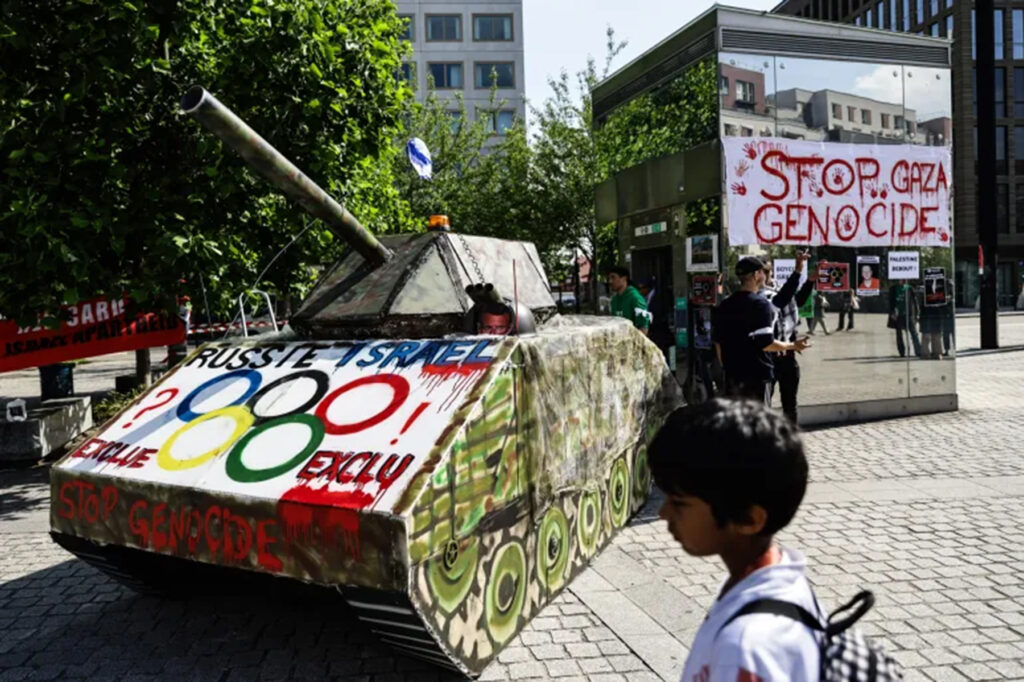 A mock-up of a tank is seen during a demonstration in Paris on June 06, 2024, calling for Israel to be banned from the 2024 Paris Olympics over its human rights violations in Gaza.