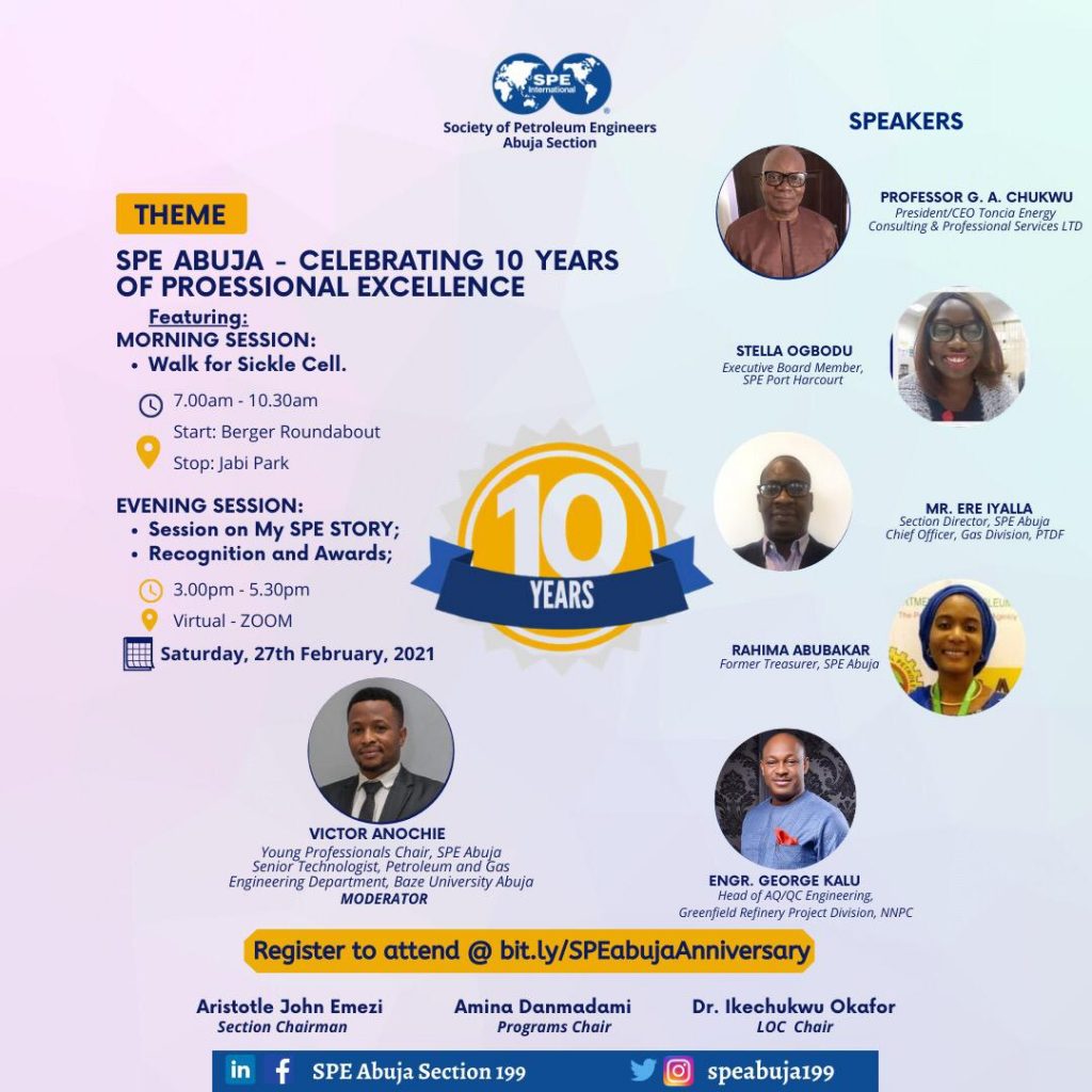 The Society for Petroleum Engineers (SPE) Abuja Section, as part of activities marking its 10th Anniversary of Professional Excellence, has concluded preparations for a Walk for Sickle Cell, slated for Abuja.